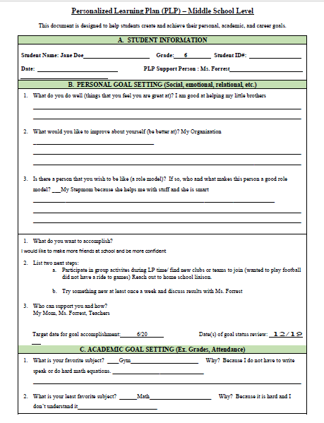A Personal Learning Plan (PLP) is a student driven, goal oriented collaboration between the student, teacher, counselors, or other stakeholders in a child's education. A PLP includes short, long term, academic, and personal goals. The purpose of a PLP is to encourage self motivation for the student as they take ownership in their own education.